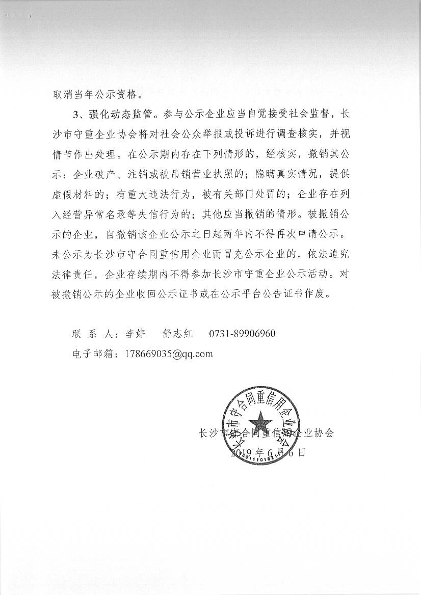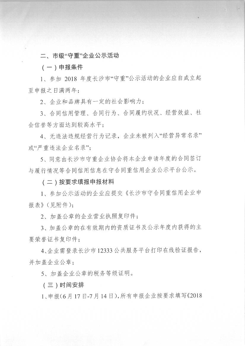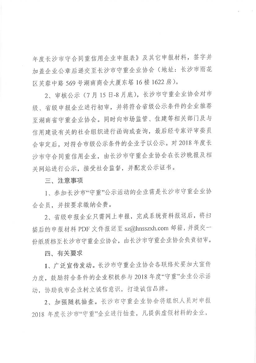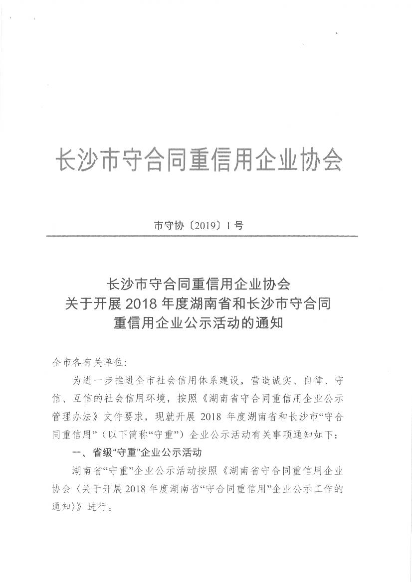 長沙市守合同重信用企業(yè)協(xié)會關于開展2018年度湖南省和長沙市守合同重信用企業(yè)公示活動的通知